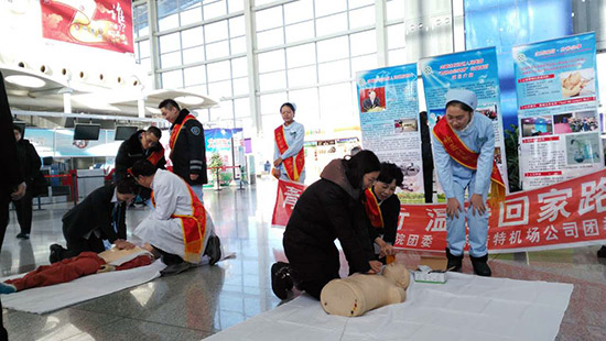 人民網呼和浩特1月13日電 13日春運進入天,上午九點,內蒙古自治區人民醫院團委與呼和浩特機場公司團委聯合啟動了“青春志愿行 溫暖回家路”主題活動在呼和浩特市飛機場大廳舉辦。現場集體宣誓服務春運、培訓機場青年掌握現場緊急救護知識,包括心肺復蘇、身體不同部位出血緊急止血方法、骨折病人搬運等。