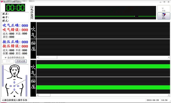 當訓練或考核操作時間結束后,即可進行成績打印。按壓、吹氣正確錯誤的次數及具體錯誤原因,按壓、吹氣所產生的圖表數據統計、受訓人的姓名、編號、成績、等功能打印,以供考試成績評定及存檔。