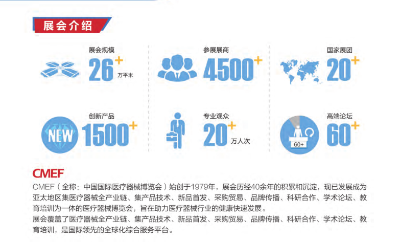 中國國際醫(yī)療器械博覽會(CMEF),始創(chuàng)于1979年,每年春秋兩屆,在經(jīng)歷了40年的不斷創(chuàng)新、自我完善,CMEF已成為醫(yī)療行業(yè)內(nèi)的專業(yè)醫(yī)療采購貿(mào)易平臺、企業(yè)形象發(fā)布地以及專業(yè)信息集散地和學(xué)術(shù)、技術(shù)交流平臺。5月13-16日,2021第84屆中國國際醫(yī)療器械(春季)博覽會即將在國家會展中心(上海)舉辦。