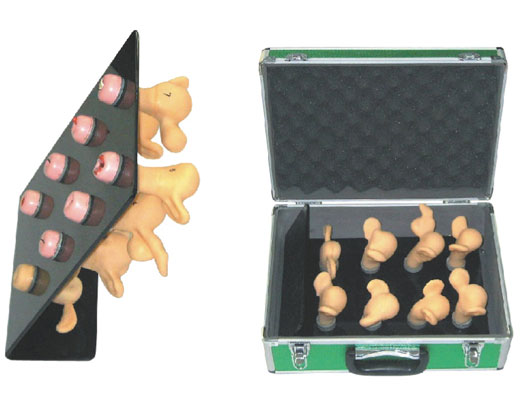 兩個正常子宮,六個病變宮頸:糜爛、線形撕裂、急性化膿性宮頸炎、癌變、息肉、感染的宮頸腺(濾泡)囊腫。