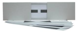 5.  圖片紙:6張,紙張大小410×105mm。兩條線寬2mm的水平直線紙片1張,兩個三角形的紙片1張,兩個寬度為10205070mm長方形紙片各1 張。圖案黑色,位于紙的對稱中心,圖案左右間隔20mm