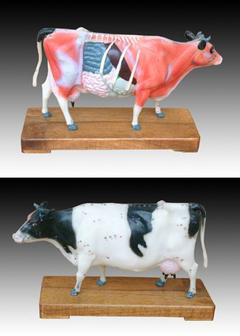 本模型顯示牛體左半部68個常用穴位,穴位用數字標注。右半部顯示解剖面。用PVC制成,供獸醫作參考用。