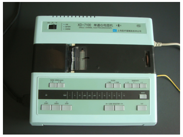 XD-7100單道心電圖機是一臺具有交直流二用功能、體積小巧、易于攜帶的心電圖機,適用于臨床診斷、搶救及心電監護。 (一)特點 1.本機設計安全,符合GB9706.1-95,I類B型及防除顫功能,為被檢查人提供了可靠的安全保證。 2.本機采用位置反饋記錄裝置,頻響高,阻尼特性好,描記所得心電圖波形清晰、真實。 3.本機具有交直流二用功能,機內裝有可充電電池的充電裝置,交、直流轉換使用極其方便。 4.本機具有二種干擾抑制電路、即交流干擾抑制及人體肌電干擾抑制,能在各種惡劣的環境下,獲得較滿意的心電圖記錄。 5.本機采用輕觸型開關,轉換導聯,驅動走紙均極為方便。 ( 二)主要指標 1.電源 交流(220V 50Hz)、直流兩用(自充電)。 2.走紙速度 分25 mm/s 和50 mm/s 兩檔。 3.增益 分1/2、1、2三檔。 4.工作狀態 分停止、觀察、記錄三檔。 (三)操作規程 1.接好地線,通電預熱。 2.定標 用1mv 標準電壓的矩形波在記錄紙上應顯示10mm 的幅度。 3.連接導聯線 紅電極連接右上肢,黃電極連接左上肢,綠電極連接左下肢,黑電極連接右下肢,胸電極連接胸部導聯位置。 4.觀察 利用工作狀態的觀察檔和移位旋鈕,將心電圖的波形置于記錄紙的中間位置。 5.記錄 觀察心電波形穩定后,利用工作狀態的記錄檔,走紙記錄心電圖。 6.利用導聯鍵切換不同的導聯。