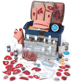 該套模型包括7套流血性傷口,15種創傷粘貼件,可組合70多種創傷情景流血的傷口包括:(泵裝置可促使人造血液流出)1個下顎傷1個腹部傷,伴小腸突出1個胸部吸吮性創傷1個復合型骨折:肱骨、前臂1個復合型骨折:股骨、大腿1個鎖骨骨折1個5厘米撕裂傷1個3厘米撕裂傷1個1厘米撕裂傷1個異物刺入1個復合型骨折:脛骨、小腿 1個手掌的搶傷1個大面積膿血傷1個小面積膿血傷1個小的新鮮創口