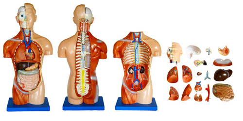 這是無性軀干模型分成18件:軀干,頭,腦,氣管,食管和主動脈,橫隔膜,肺(4件),心臟(2件),胃,肝,腎,胰和脾,腸,脊椎神經。脊椎露在外面。用PVC制成,安放于塑料座上。尺寸:42CM。
