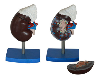 本模型適用于講解人體解剖有關泌尿器官課程時作直觀教具用。顯示腎的形態和結構:腎,腎上腺,腎管和腎上腺管,輸尿管的上部等。模型可取下供仔細研究。自然大小,分成2件。