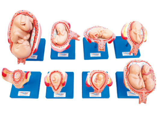 功能特點:該模型由妊娠胚胎發育過程一、二、三、四、五、六、七個月胚胎和五個月雙胞胎等8個模型組成,期中四、五、六、七個月胚胎和五個月雙胞胎模型胎兒可以取出,并顯示子宮、陰道、胎兒、臍帶、胎盤、羊膜腔以及卵巢、輸卵管等結構。