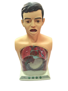 1、 模型為成年男性上半身,可實現洗胃時的多種體位;仰臥位、左側臥位、坐位解剖結構精確, 包括牙、舌、懸雍垂、氣管、支氣管、左右肺臟、食管、胃、膈、膽囊、胰腺、脾、十二指腸、 結腸等結構。