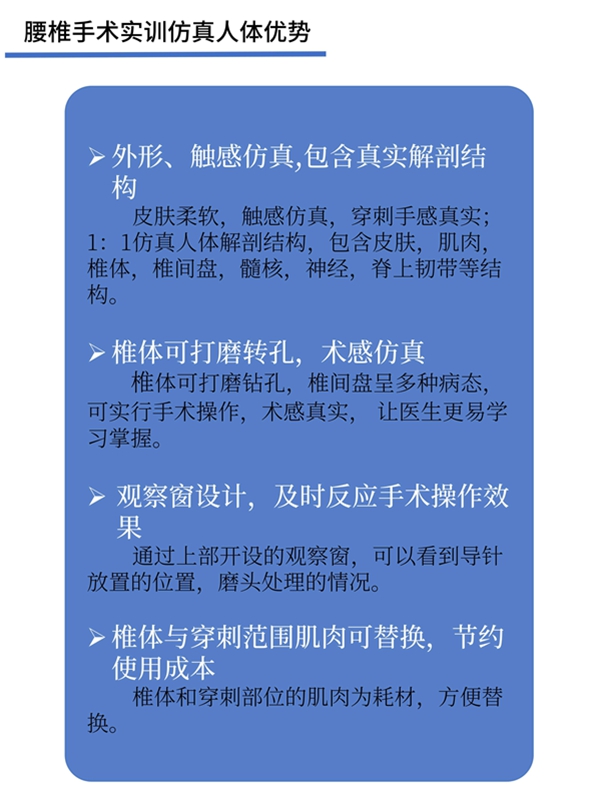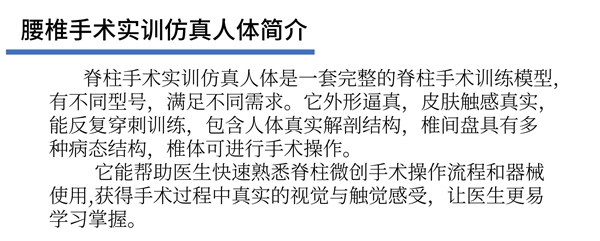 腰椎手術實訓仿真模擬器"/> 是一套完整的腰椎椎間孔內窺鏡微創手術訓練模型,它能幫助醫生快速熟悉腰椎內窺鏡微創手術操作流程和器械使用,獲得手術過程中真實的視覺與觸覺感受,讓醫生學習曲線更陡峭 。歡迎閣下致電021-64188321了解更多!"/>