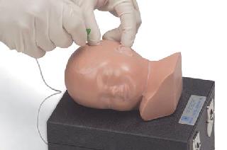 Simulated infant head with internally molded scalp veins designed for practicing neonatal peripheral venous access of the scalp veins.