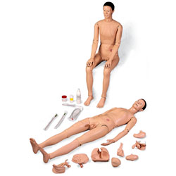 由耐用、可反復清洗的材料制成使用了不銹鋼關節,該模型可以如真人一般做出多種姿勢,并且可以在無外力支撐的情況下呈坐姿帶有可拆卸的假牙、6個可相互替換的注射模塊及可替換使用的男女器官模型的右腿、胸腔、腹腔臟器均可拆卸,如肺、胃、心臟、腸、膀胱和內部生殖器等