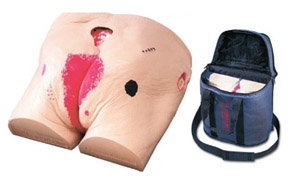 some with the additional complications of undermining, tunneling, sinus track, fistula, slough, infection, and exposed bone. Also displayed are an unstageable eschar, a sutured wound, herpes, and candidiasis. Demonstrate and practice wound cleansing, classification, staging, and assessment, as well as the measurement of wound length, depth, undermining, and tunneling. All types of dressings including alginate biosynthetic, collagen, gauze, hydrocolloids, hydrogels, skin substitutes, transparent films, and wound fillers can be applied. The positioning of the wounds permits multiple dressings to be demonstrated at the same time. Dimensions: 6-5/8" x 11" x 13-5/8".